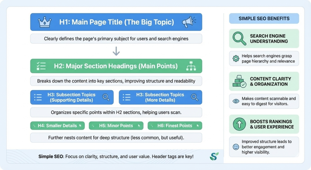 Header tags help you organize your content. They also help search engines understand your page. This guide explains header tags using Simple SEO rules.